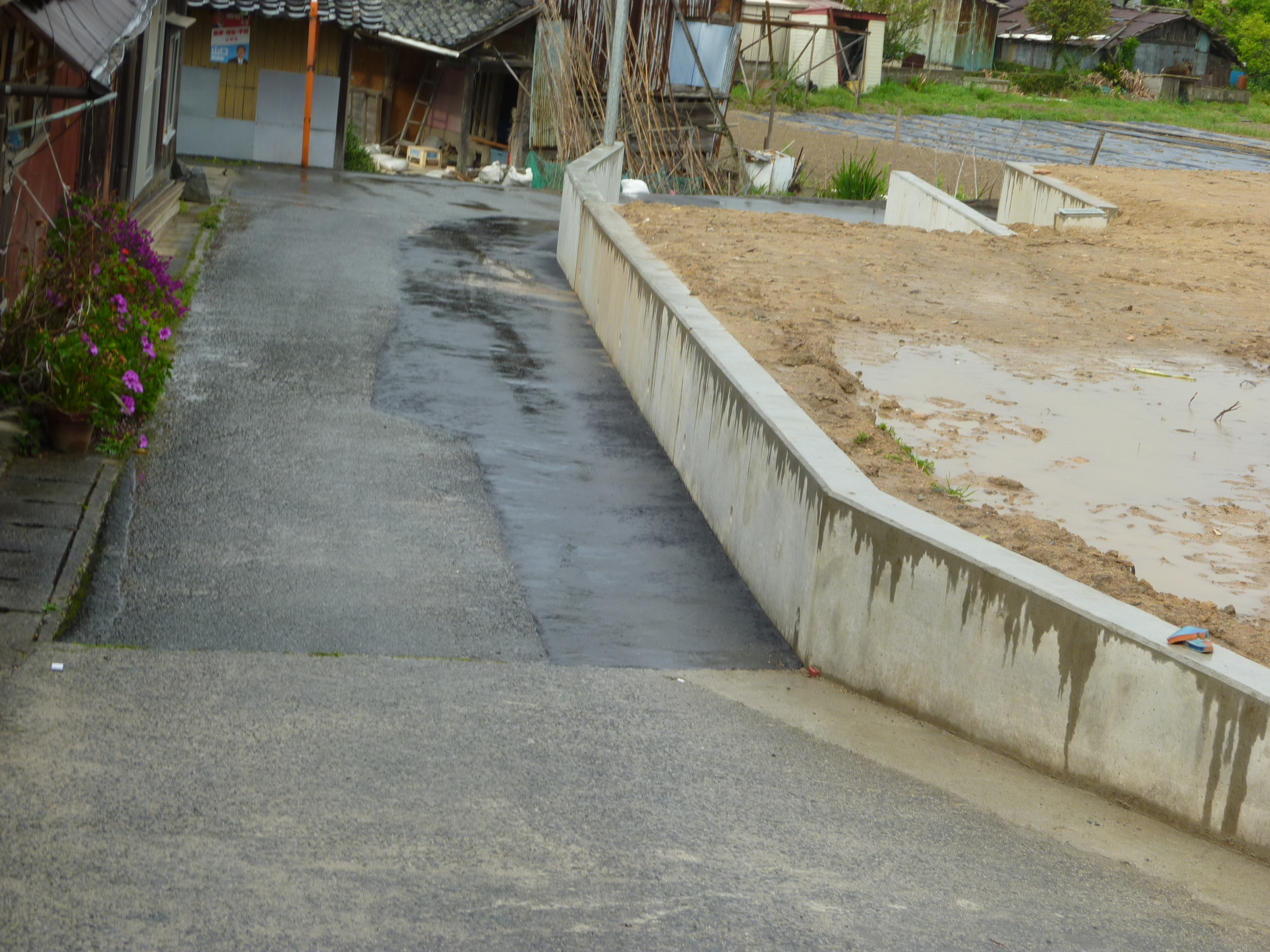 糸島市二丈福井のお住まいの方から、「自宅へ入る前のお宅がセットバックしていただき、道が拡張されたが、雨が降ると車のタイヤが、ぬかるみに入り込んで大変です。早く舗装をして欲しい。」と相談を受けました。早速、糸島市建設課に申し入れました。4月17日に舗装が完了したとの報告を相談者からいただいていた。4月28日(水)現地を訪問。雨が降り出したにも関わらず、私の来るのを待っておられ、早速、現地の確認、説明をお受けした。一緒に喜びを共有した。その後、セットバックしていただいたお宅に伺い、セットバックしていただいたお礼を申しあげた。