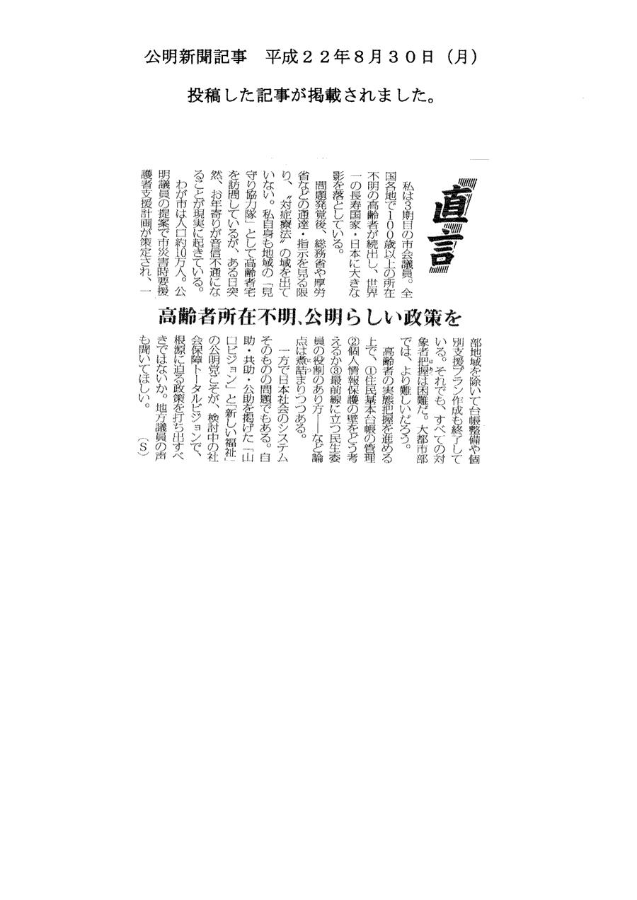 公明新聞:平成22年度8月30日(月)号「高齢者所在不明、公明らしい政策を」として記事が掲載されました。