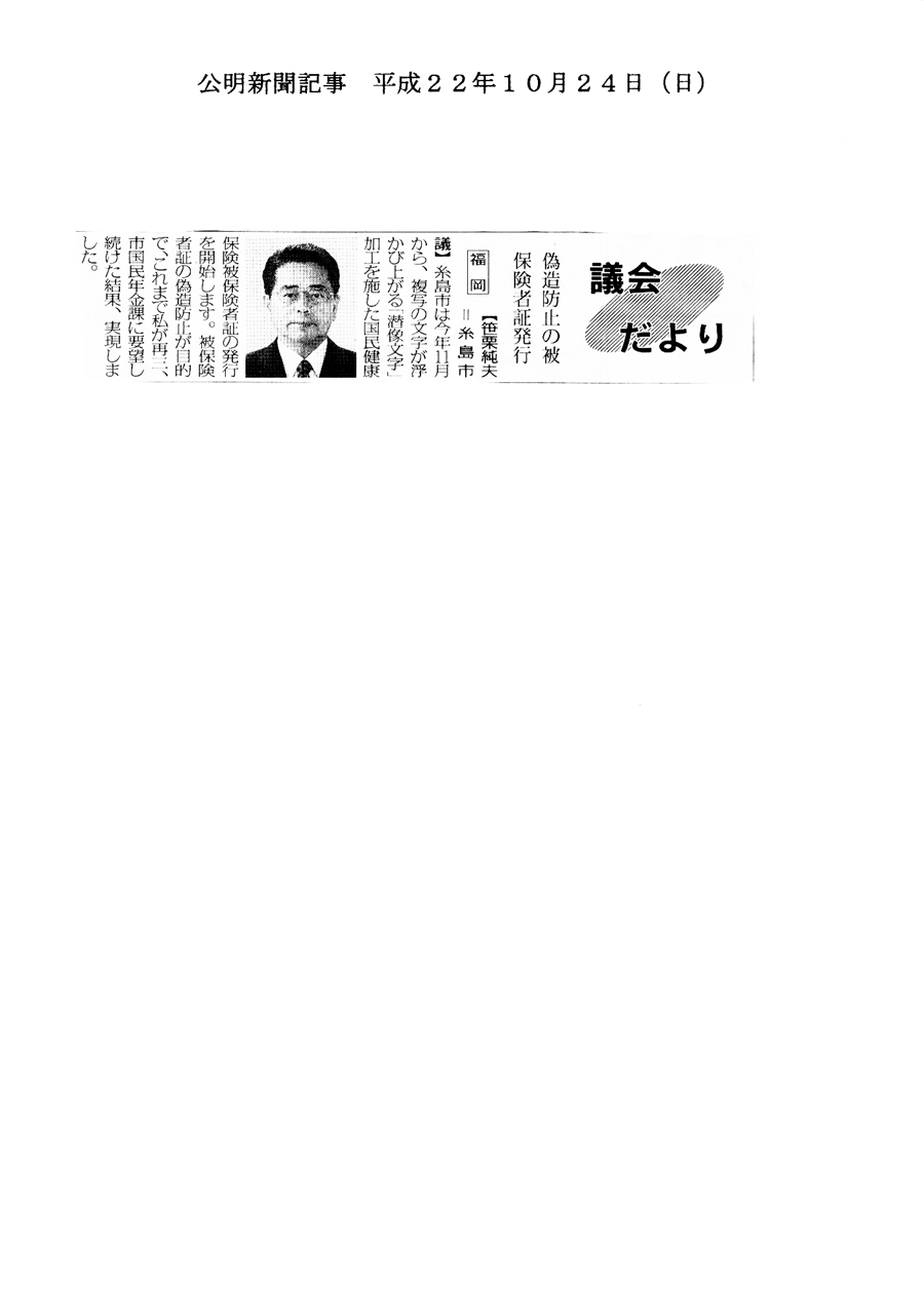 公明新聞:平成22年度10月24日(日)号に「議会だより:偽造防止の被保険者証発行」として記事が掲載されました。