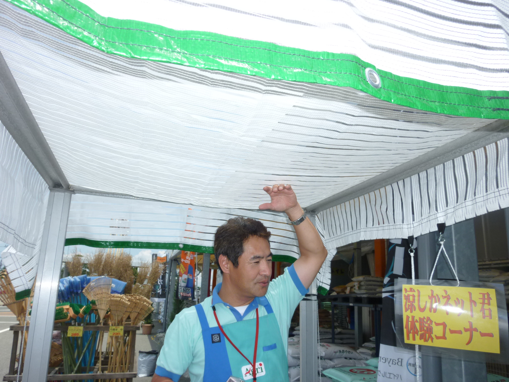 12日、西日本新聞で「“遮光シート”で部屋を涼しく」の見出しで報道された「涼しいかネット君」発案者のJA糸島の農園芸資材販売店「アグリ店」古藤俊二店長にあってきました。古藤店長は、これまで、ダンボールコンポスト「すてなんな君」や校庭の芝生化で威力を発揮している「鳥取方式芝生」普及など、いかんなくアイデアを世に出して来られた方。短い時間ではありましたが、店長よりレクチャーを受けて参りました。