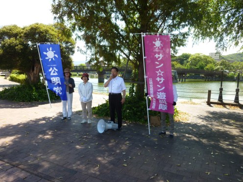 8月13日(土)午前10時から、公明党糸島市議会の黒田公二議員と公明党女性局の「サン☆サン遊説隊」と合同で「8.15終戦記念日街頭演説会」を行いました。