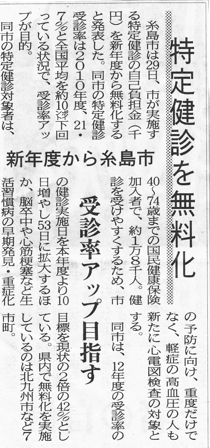 西日本新聞で「特定健診を無料化」の記事が掲載