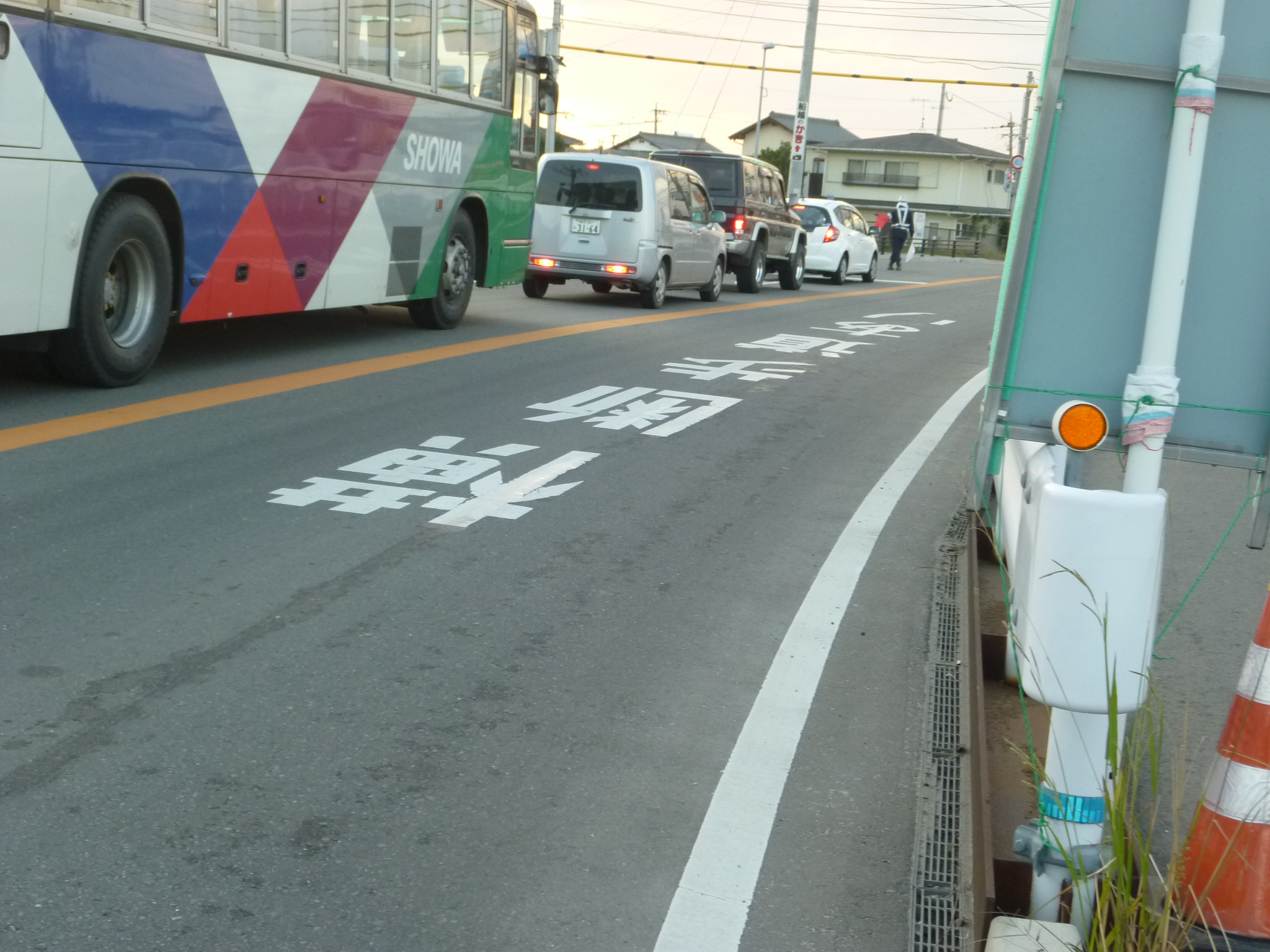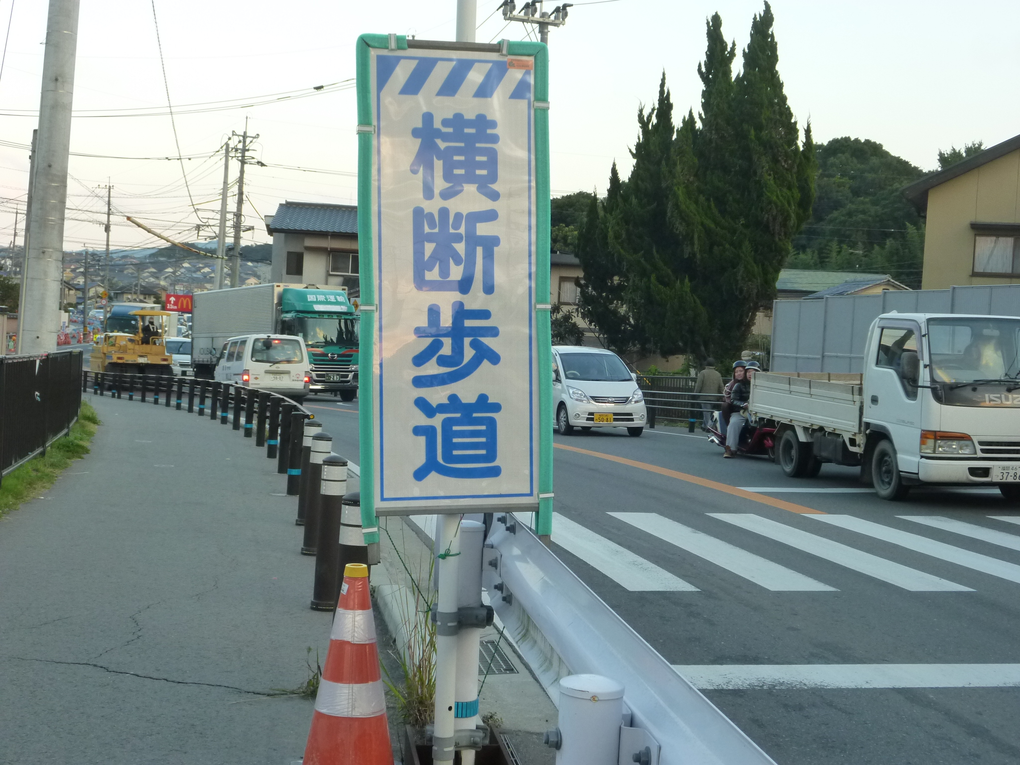 仮橋手前の歩道でもあるので、歩行者用信号機はついていないものの、車両に注意を喚起する取り組みがしっかりなされていた。