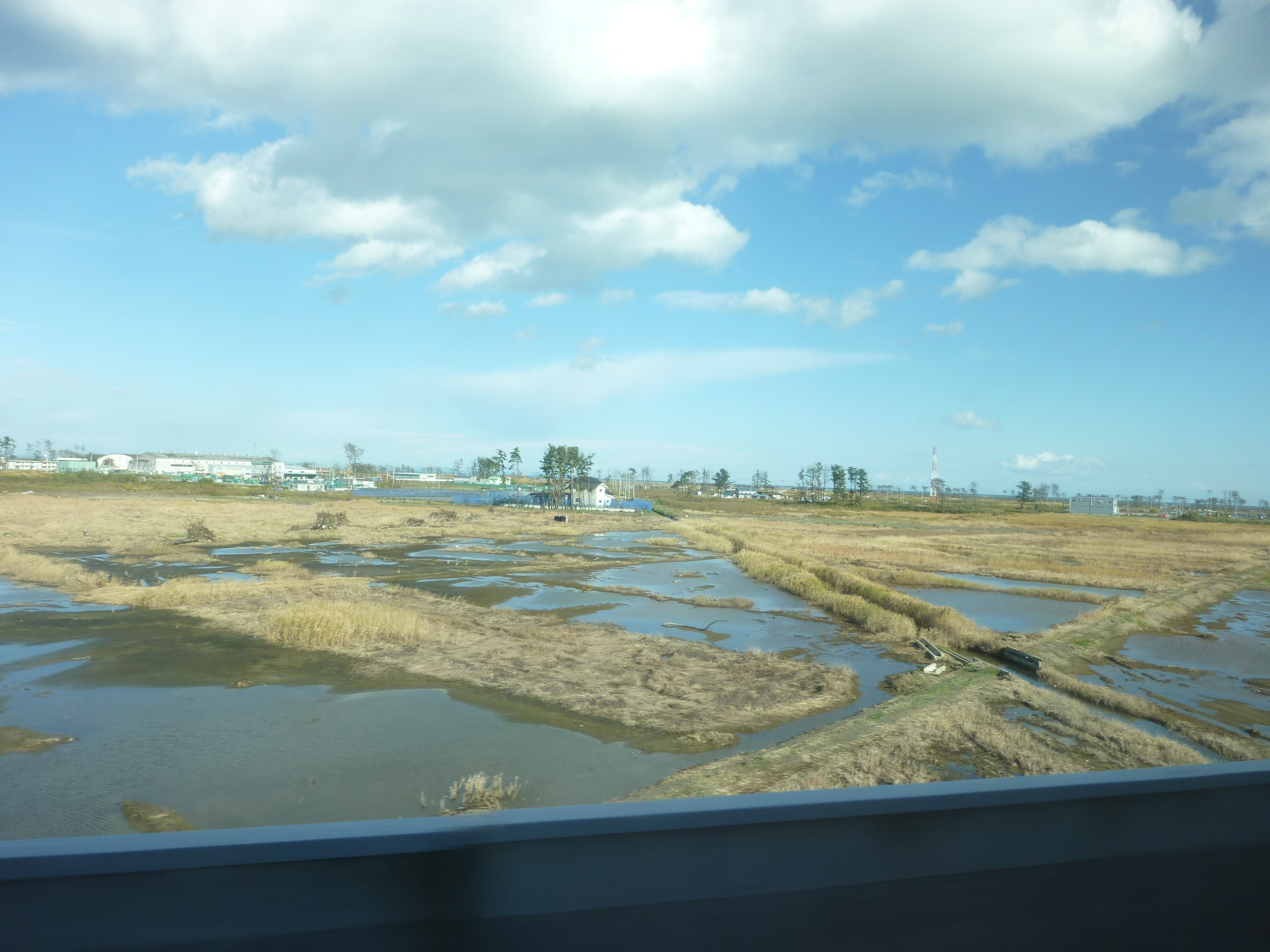 それにしても、仙台駅から仙台空港へのアクセス線に乗車して名取市を通り過ぎたところから、風景が一変した。瓦礫は撤去されているものの地盤が沈下して、水たまりの平地が広がっていた。