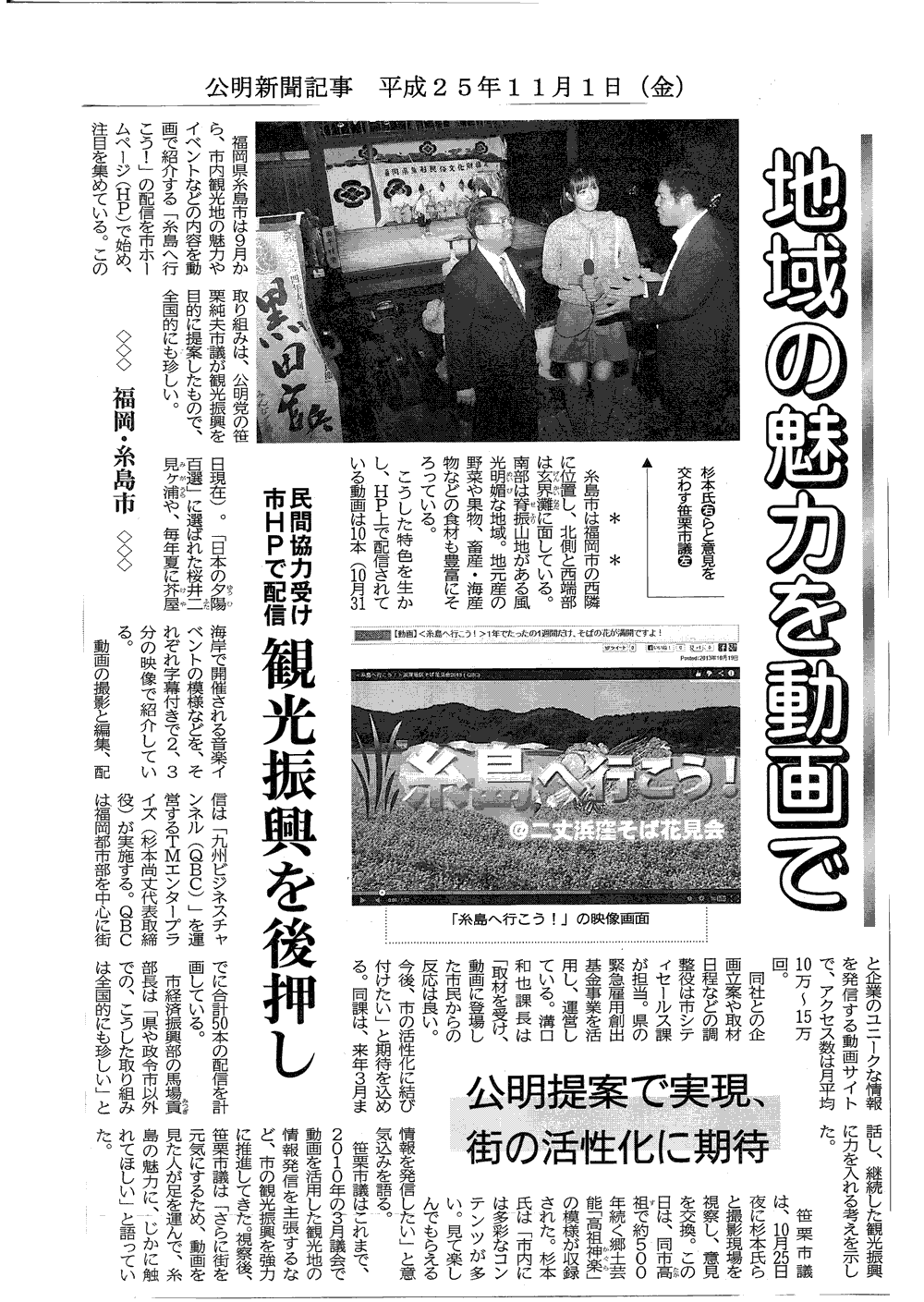 公明新聞:平成25年度11月1日(金)号『地域の魅力を動画で』