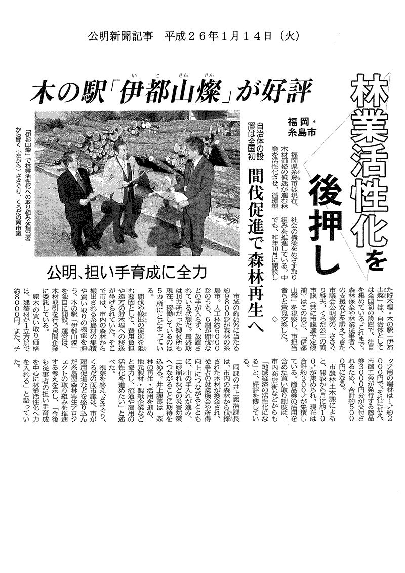公明新聞:平成26年度1月14日(火)号『林業活性化を後押し』として記事が掲載されました。