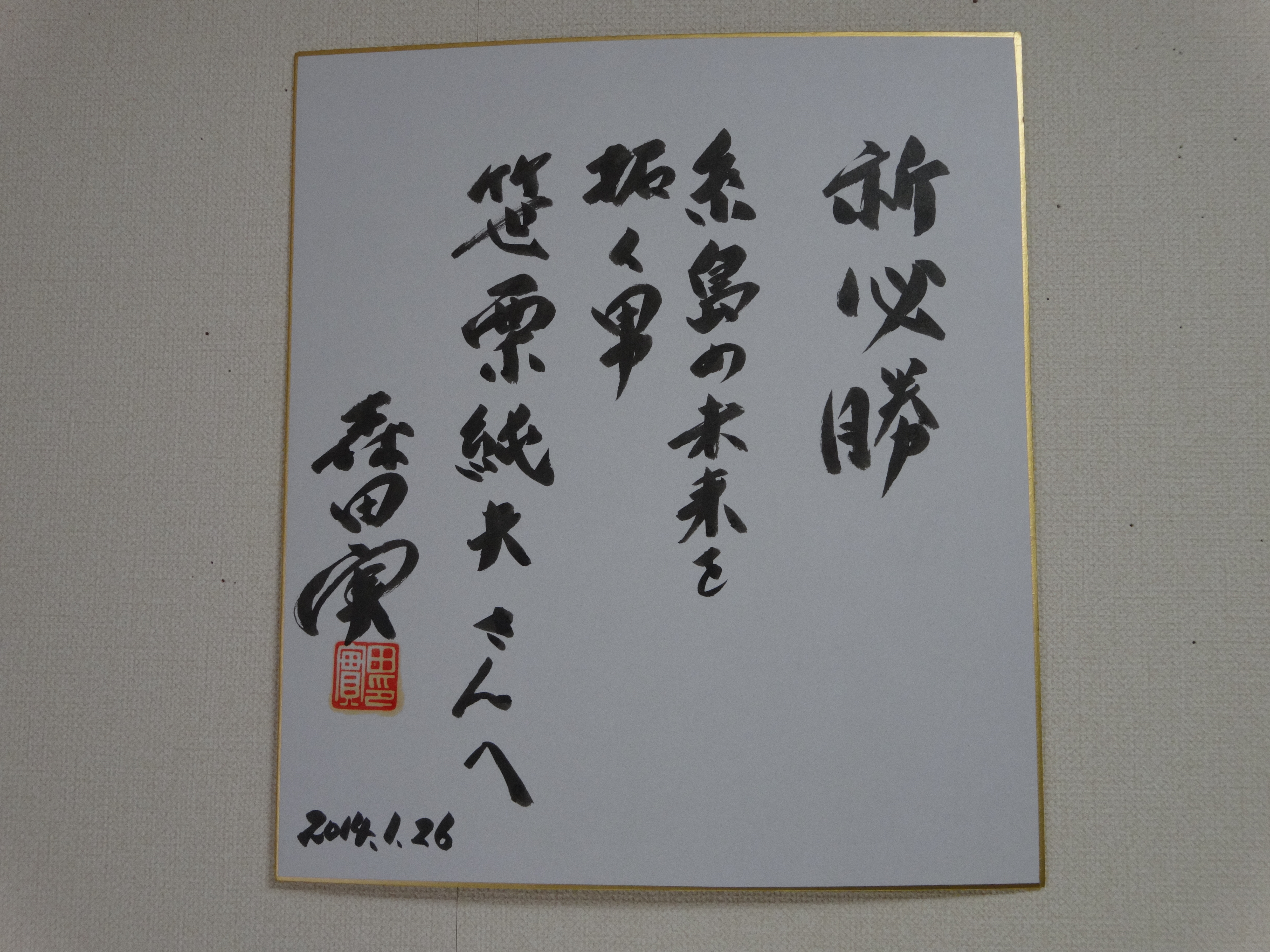 1月26日(日)糸島市議選告示日に間に合うように、森田先生から私宛に「祈必勝 糸島の未来を拓く男 笹栗純夫さんへ 森田実印 2014.1.26」との為書きを頂戴いたしました。