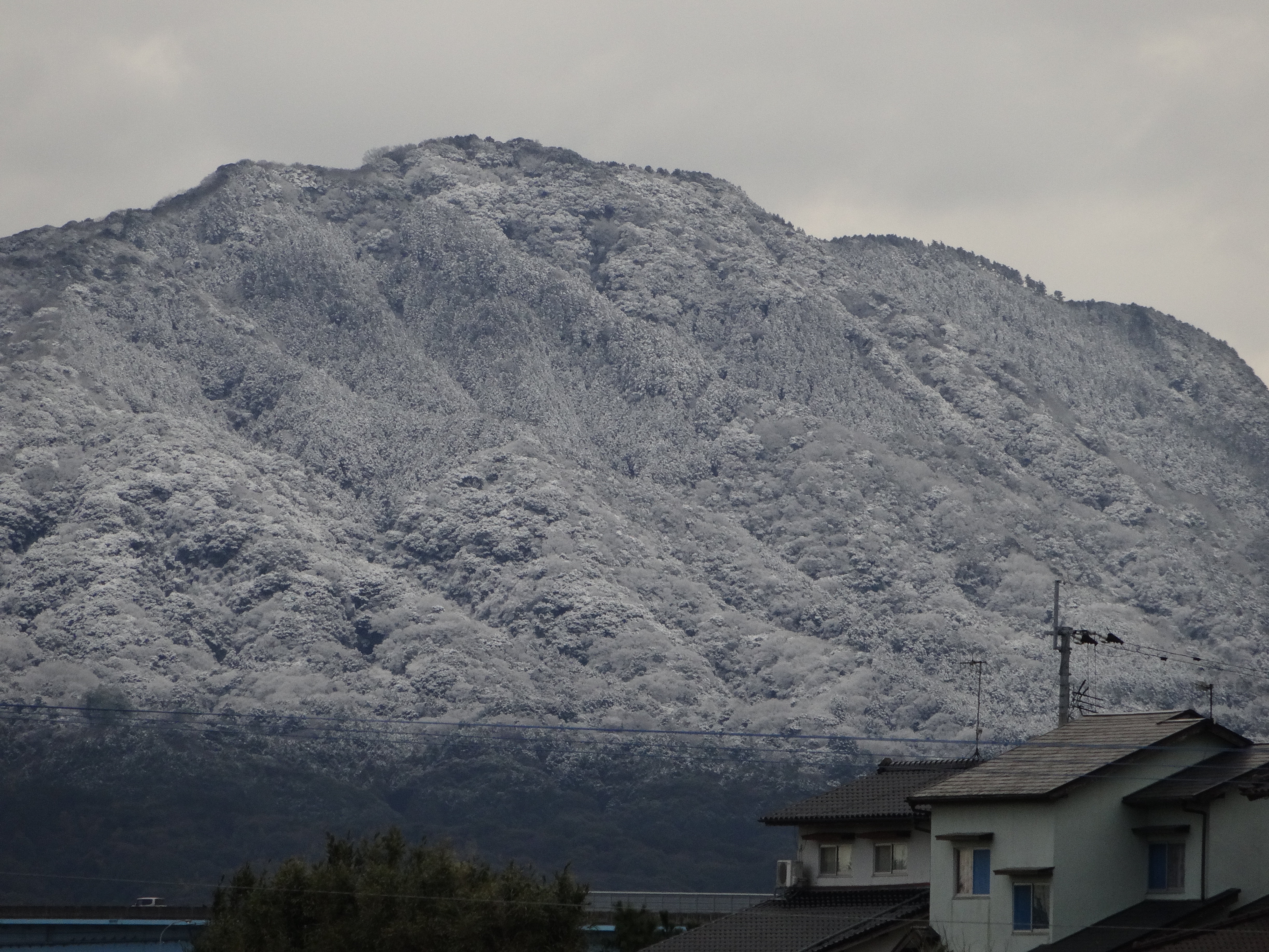 カーテンを開けると背振山系はすっぽり雪に覆われていました。平地は雨だったようで、地面が濡れていました。