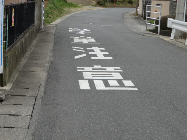 通学路の狭い箇所には「学童注意 スピード落とせ」に表示が新たに書かれました。