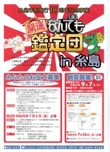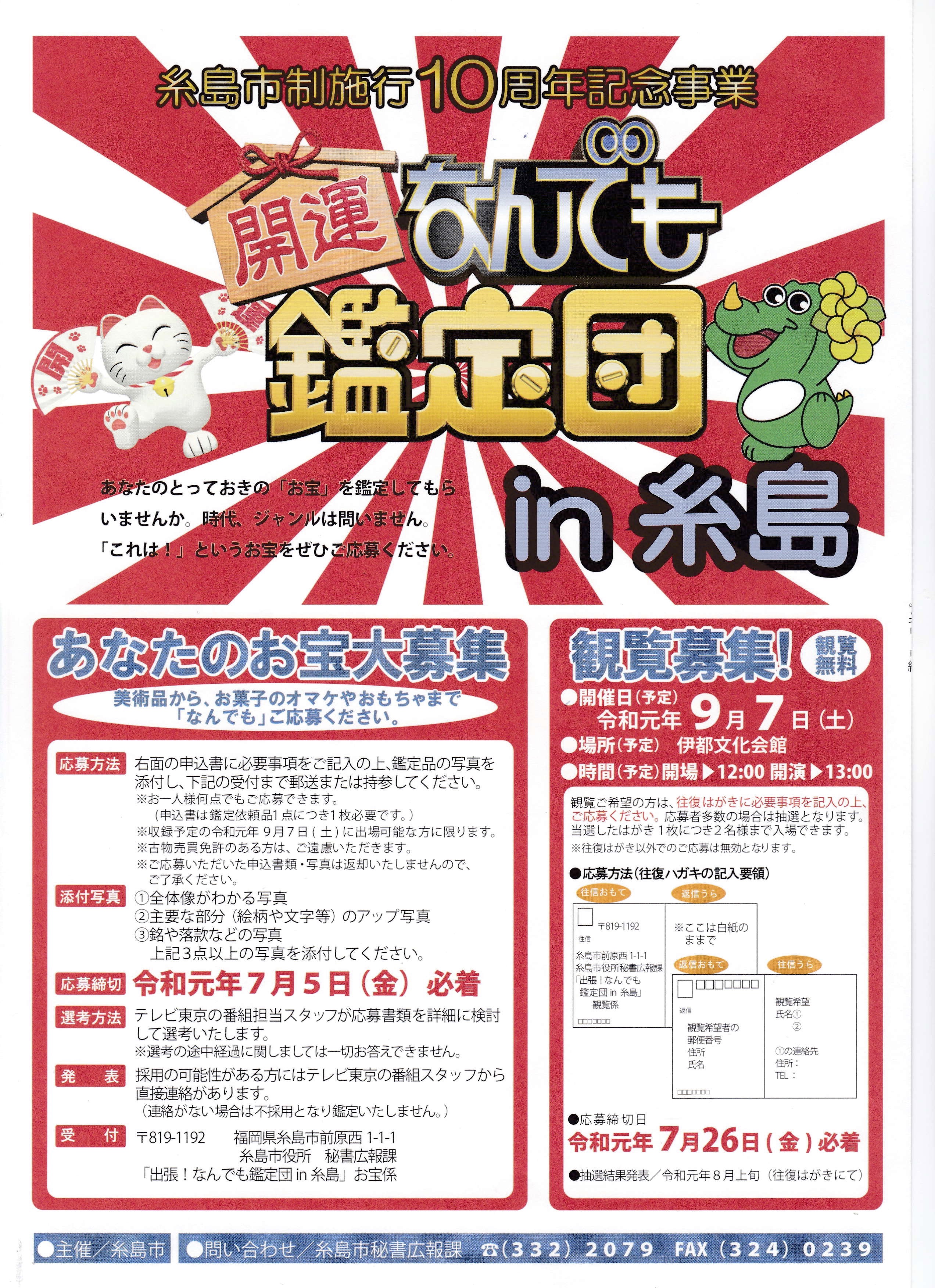 この度、糸島市制施行10周年記念事業として令和元年9月7日(土)に「なんでも鑑定団in糸島」が開催されるようになりました。