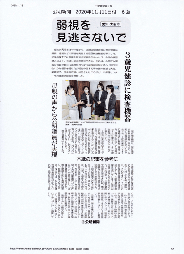【メディア紹介】11月11日公明新聞6面 弱視を見逃さないで 3歳児検診に検査機器/愛知・大府市の取り組みに波紋