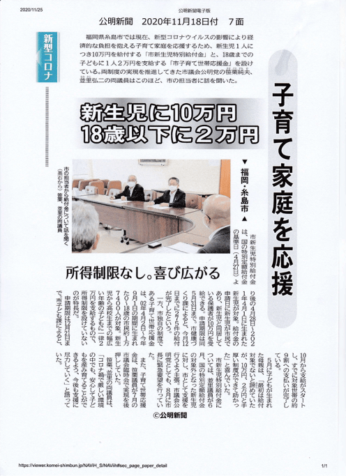 公明新聞:令和2年度11月18日(水)号「子育て家庭を応援」として記事が掲載されました。