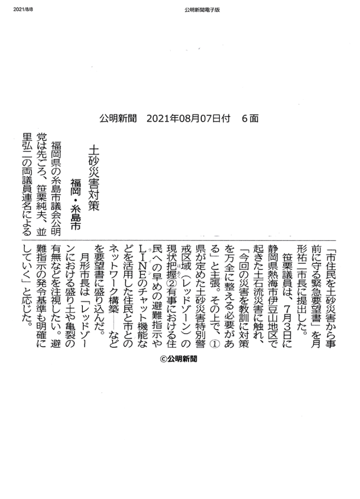 公明新聞:令和3年度8月7日(土)号「土砂災害対策」として記事が掲載されました。