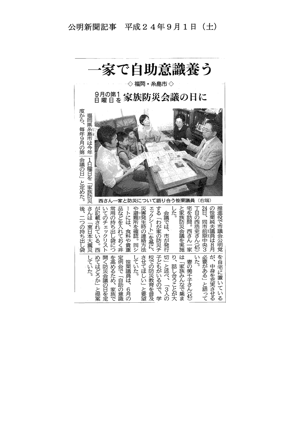 公明新聞:平成24年度9月1日(水)号『一家で自助意識養う』