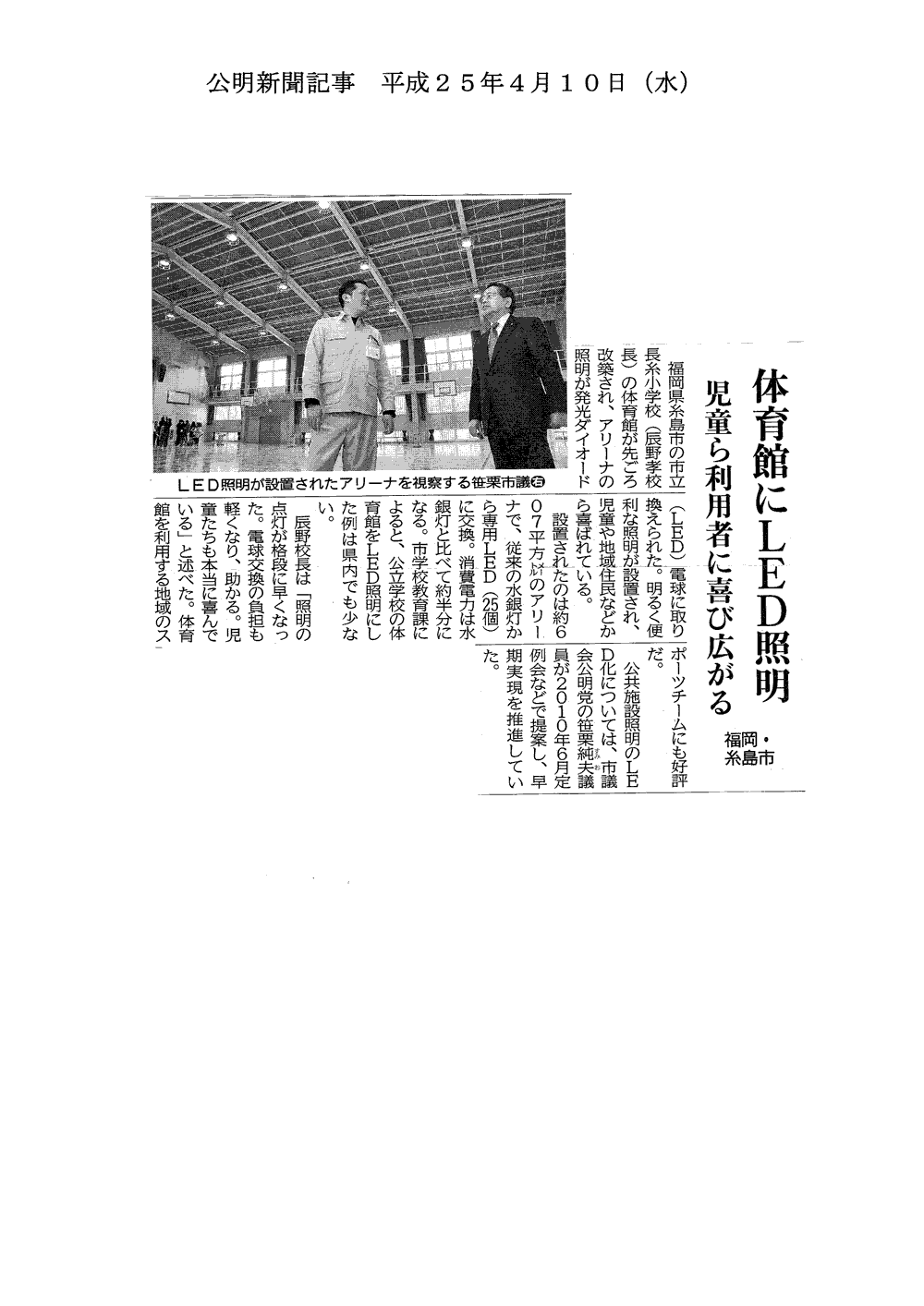 公明新聞:平成25年度4月10日(水)号『体育館にLED照明』