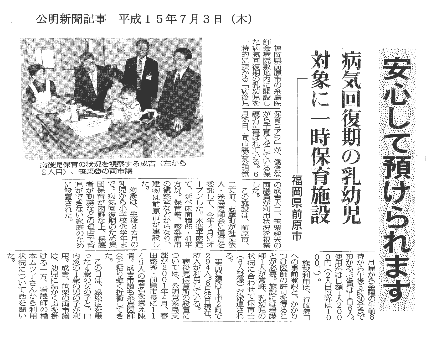 公明新聞:平成15年7月3日(木)号「病気回復期の乳幼児対象に一時保育施設」