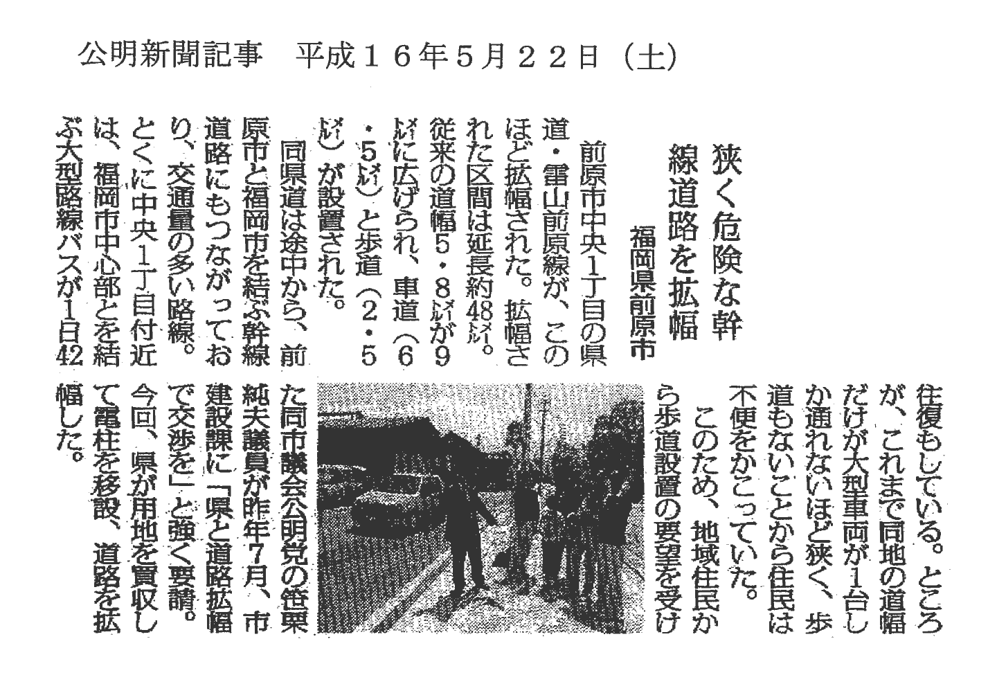 公明新聞:平成16年度5月22日(土)号に「狭く危険な幹線道路を拡幅」として記事が掲載されました。