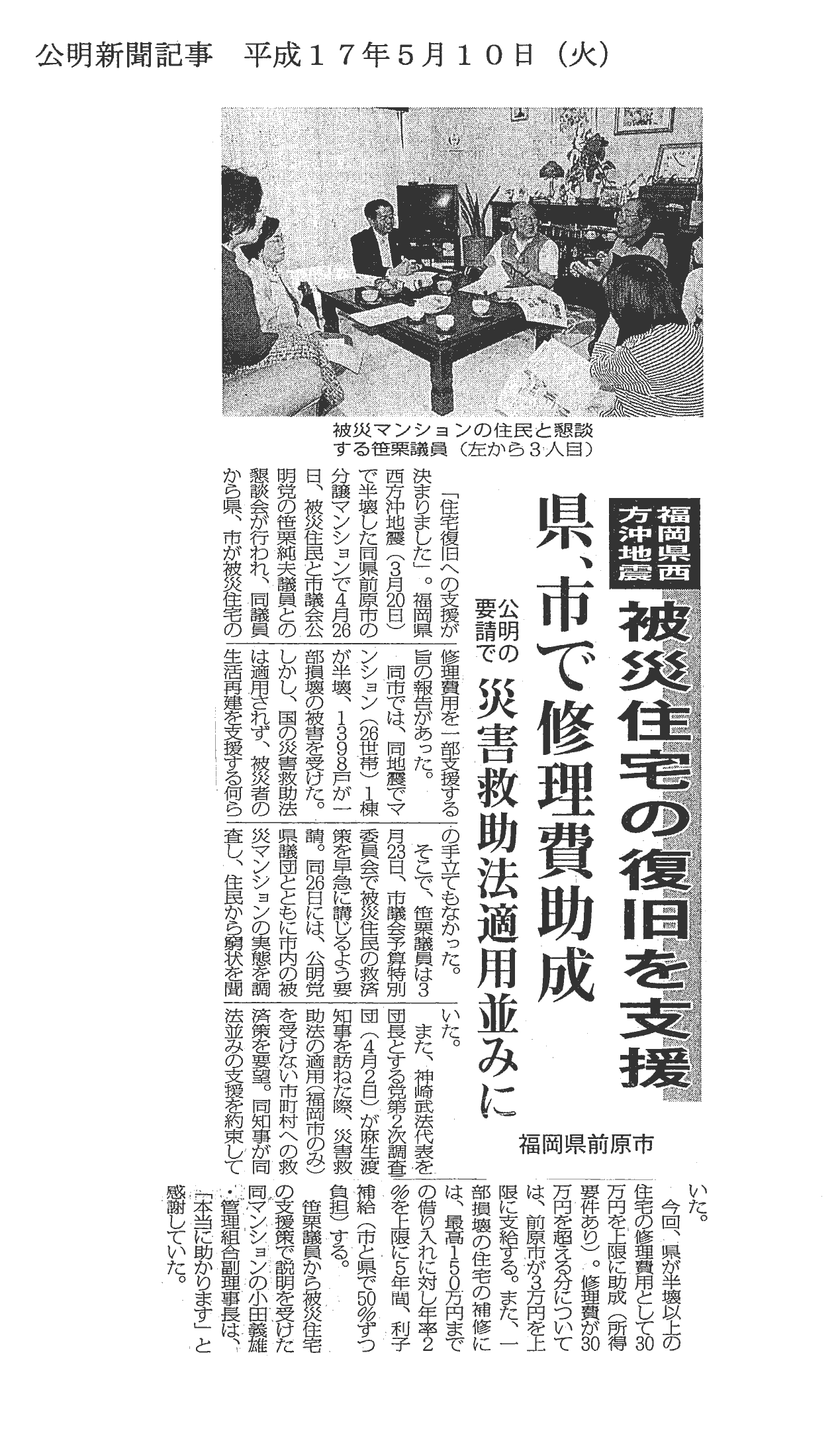 公明新聞:平成17年度5月10日(火)号「福岡県西方沖地震 被災住宅の復旧を支援」