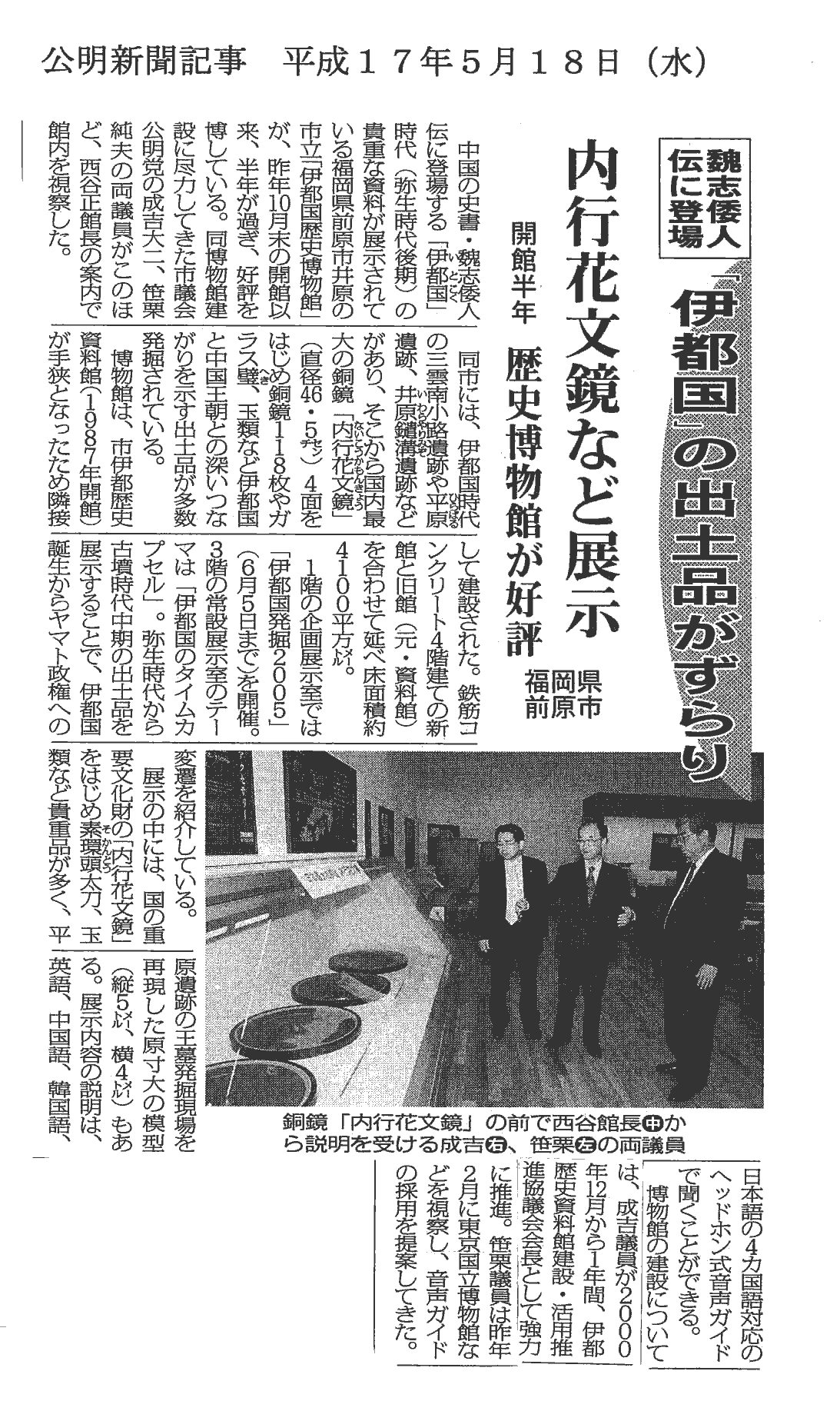 公明新聞:平成17年度5月18日(水)号に「魏志倭人伝に登場 「伊都国」の出土品がずらり」として記事が掲載されました。
