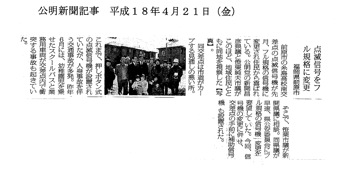 公明新聞:平成18年4月21日(金)号に「点滅信号をフル規格に変更」として記事が掲載されました。