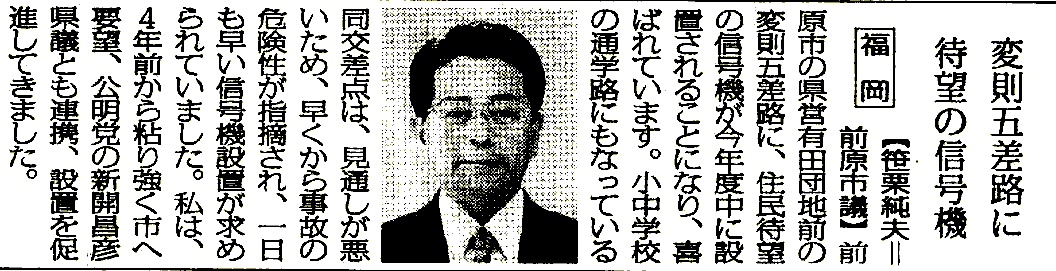 公明新聞:平成18年9月24日(日)号に「変則五差路に待望の信号機」として記事が掲載されました。