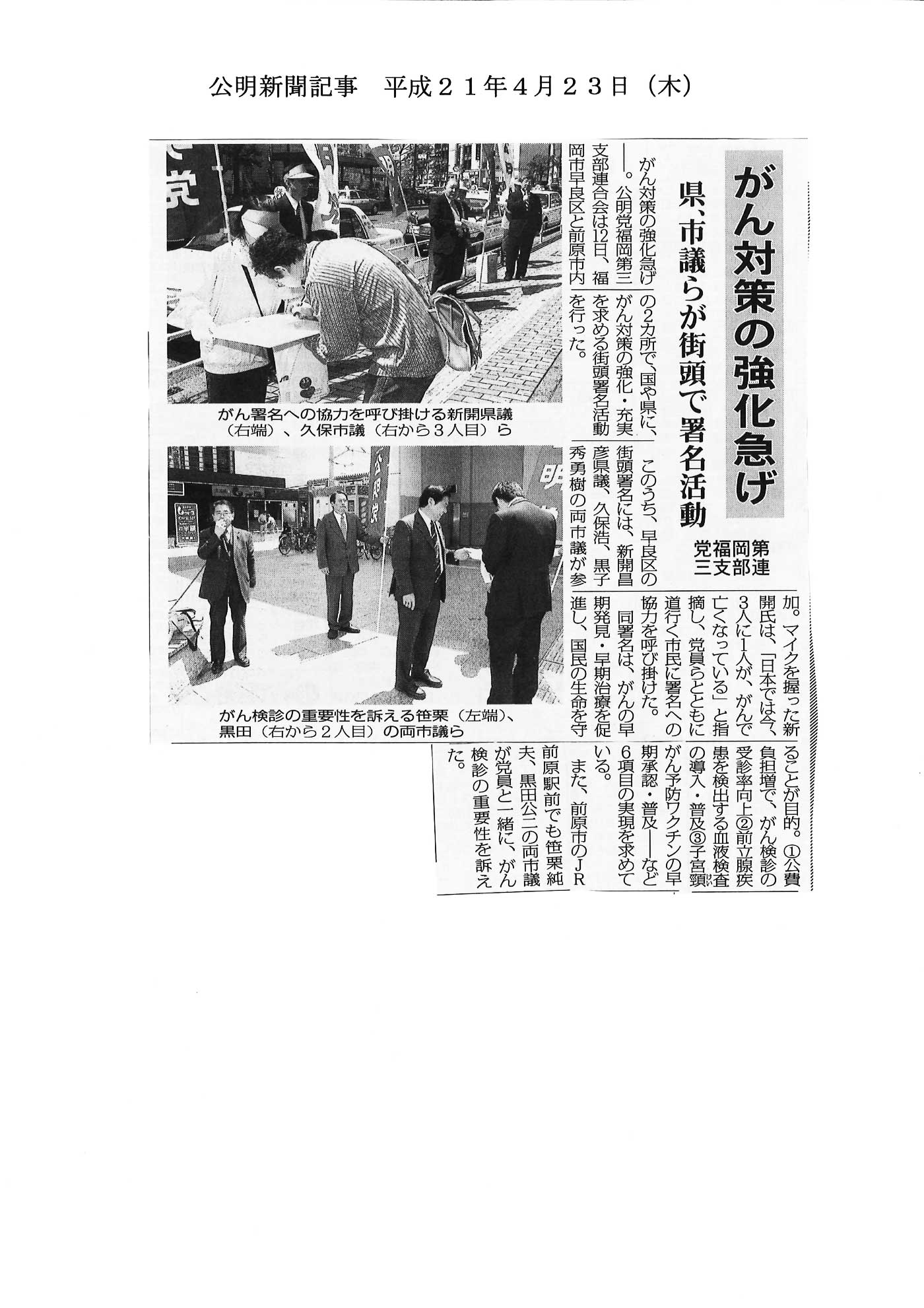 公明新聞:平成21年4月23日(木)号「がん対策の強化急げ 県、市議らが街頭で署名活動」