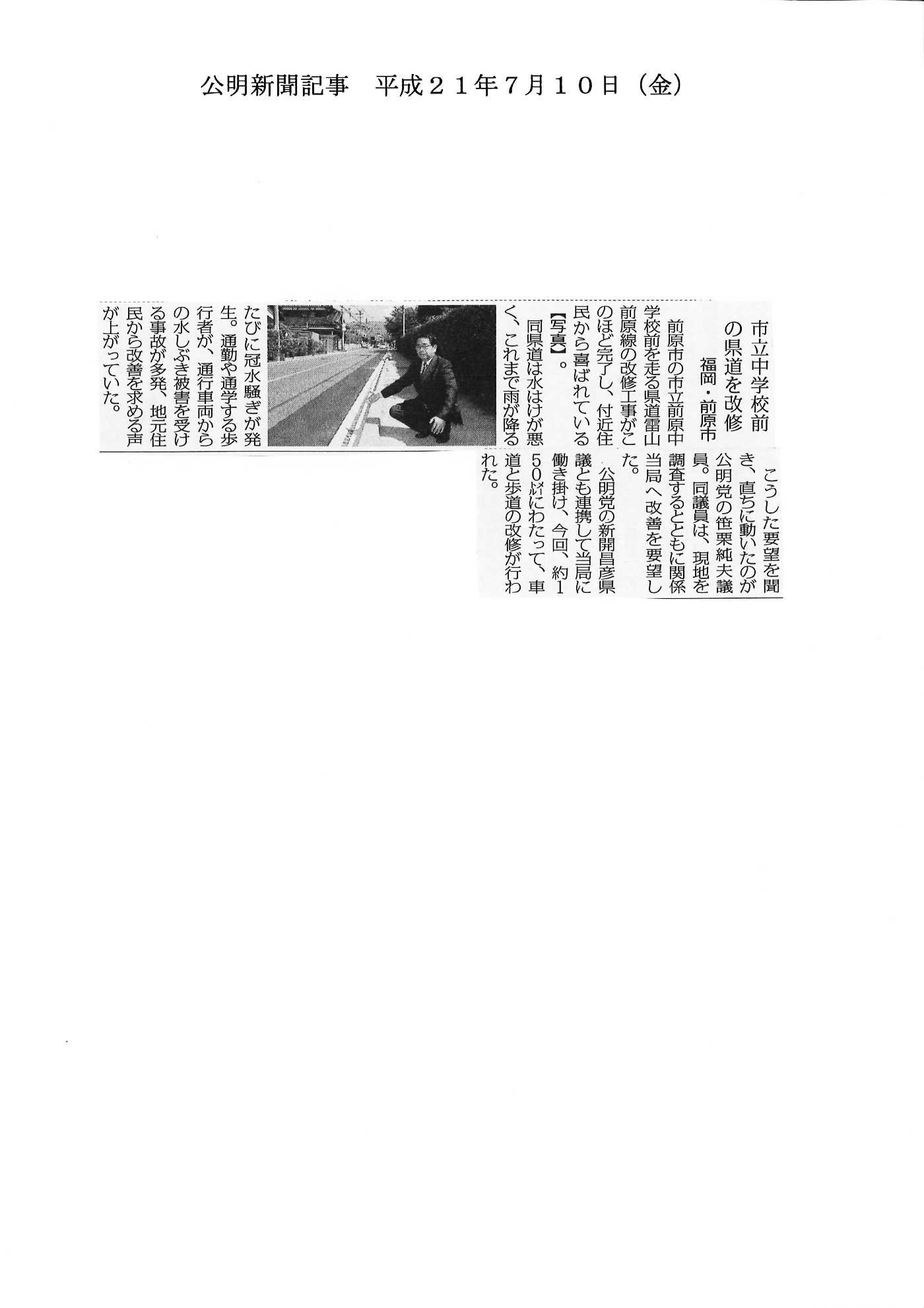 公明新聞:平成21年7月10日(金)号に「市立中学校前の県道を改修」として記事が掲載されました。