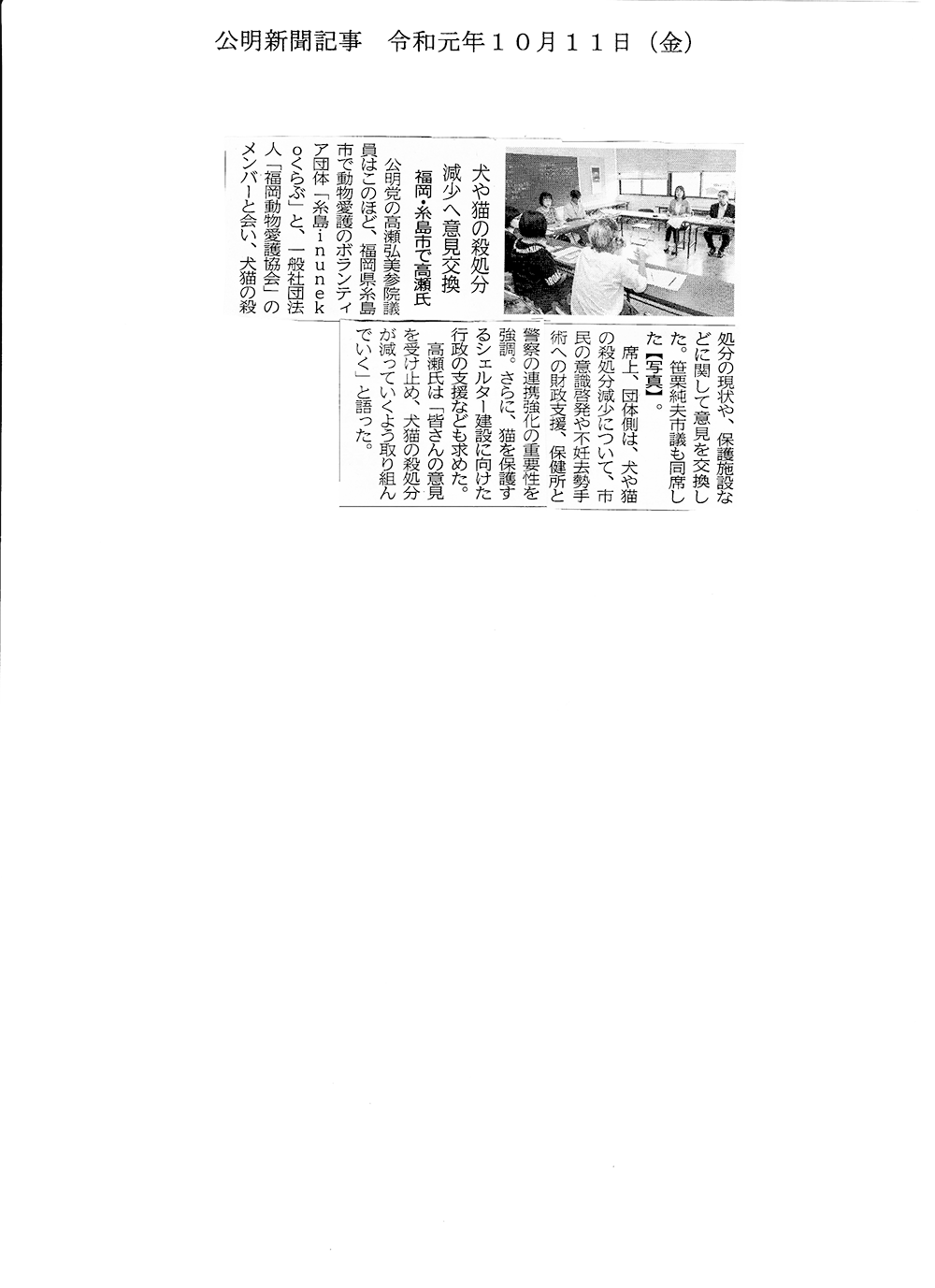 公明新聞:令和元年度10月11日(金)号「犬や猫の殺処分減少へ意見交換」